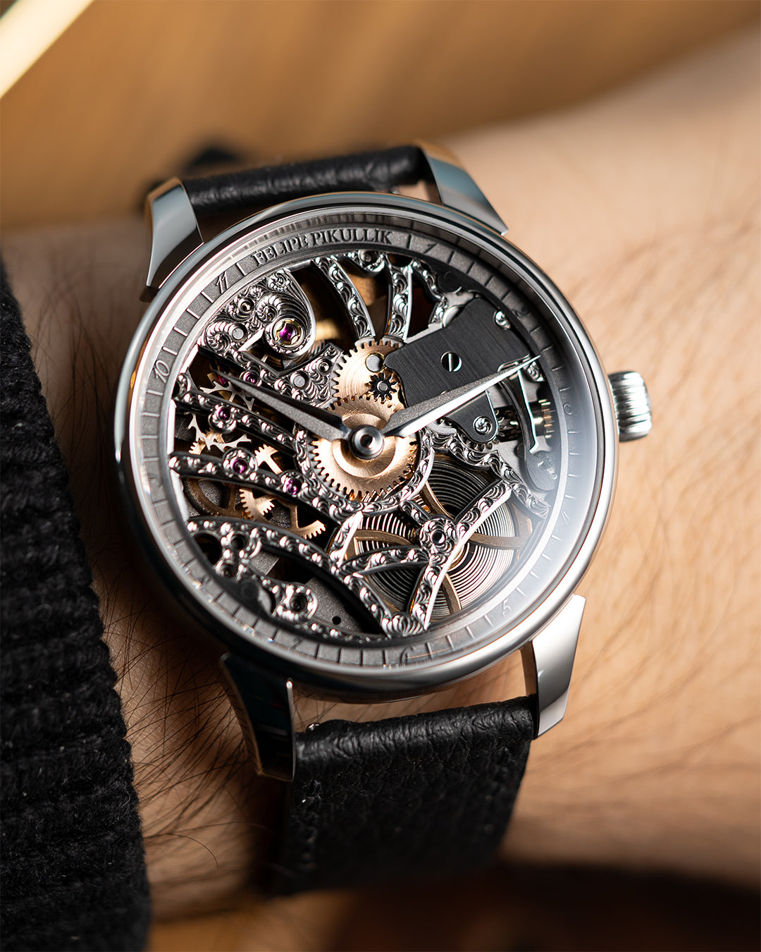 Every component in the FPSK24 is carefully shaped and finished by hand using time-honored methods. From hand-applied bevels to frosted surfaces and engraved details, the watch reflects Felipe’s mastery of skeletonization—a technique he began perfecting early in his career. Unlike automated processes, this approach demands precision, patience, and deep material understanding.