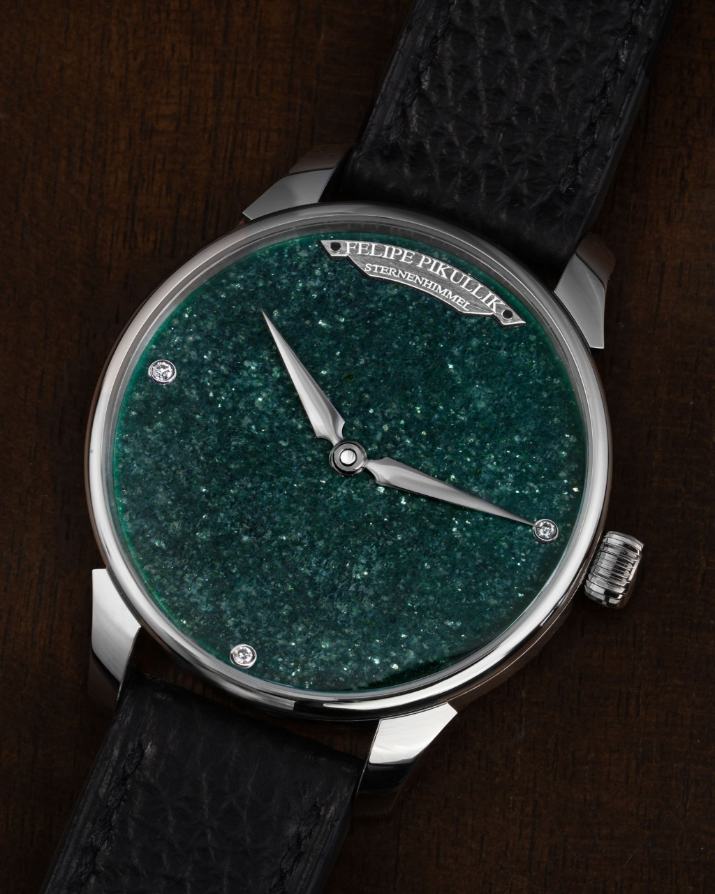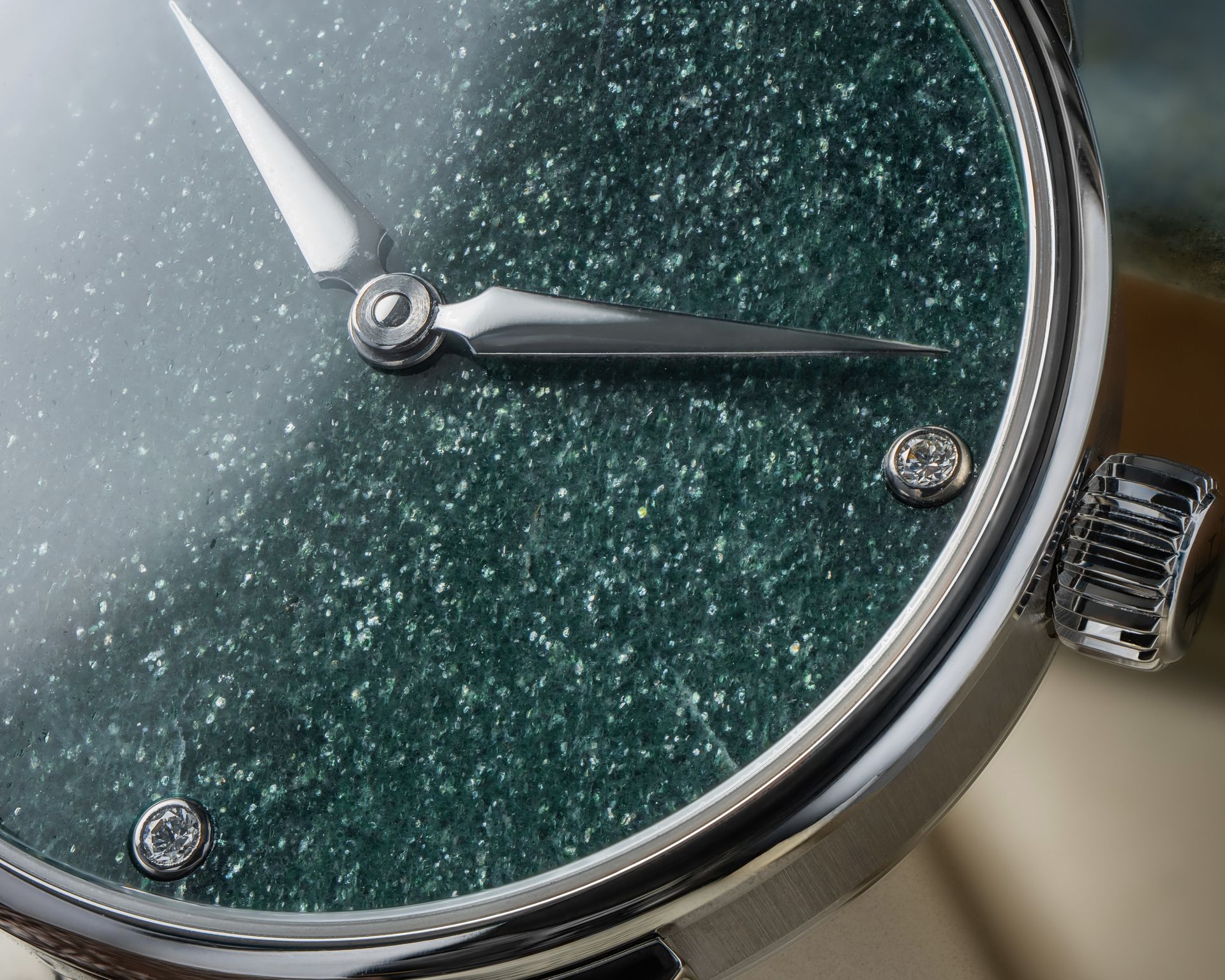 The dial is crafted from green aventurine, its surface alive with fine mineral inclusions that create a dense and softly shifting field of light.